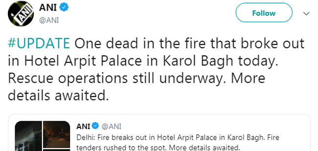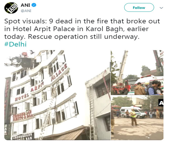 नई दिल्ली: दिल्ली के करोलबाग इलाके में मंगलवार तड़के होटल अर्पित पैलेस में भीषण आग लग गई। अब तक 9 लोगों की मौत की खबर आ रही है और बड़ी संख्या में लोग होटल के भीतर फंसे हैं, जिन्हें निकालने का प्रयास दिल्ली पुलिस और दमकल विभाग के कर्मी कर रहे हैं। जान गंवाने वालों में सात पुरुष, एक महिला व एक बच्चा शामिल है। अभी राहत-बचाव कार्य में जुट गई हैं. हालांकि, मृतकों की संख्या में अब भी इजाफा होने की आशंका है |